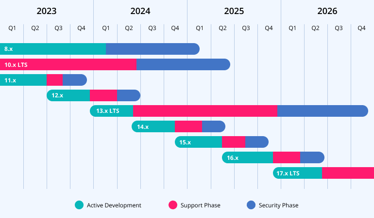 - Security Phase: After the Support phase, the version enters a Security phase, lasting 3 months (or 12 months for LTS versions). During this time, only critical security issues are resolved. Once the Security phase ends, the version reaches End of Life (EOL) and is no longer supported.